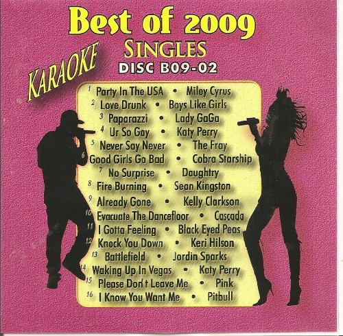 BEST OF 2009 #2 Karaoke POP CDG Disk #2-(B09-02). This Very Good quality disk is manufactured by the same company who makes the Karaoke Kurrents sets. Comes packaged in a plastic jewel sleeve with color artwork. This disk will play the music without lead vocals on any CD player but you will need a CD+G player if you want to see the lyrics on your TV. The songs are not performed by the original artists but are very good quality studio reproductions. There are no guide vocal tracks on this disk but there are Background vocals included.Here are the tracks on this great disk:
